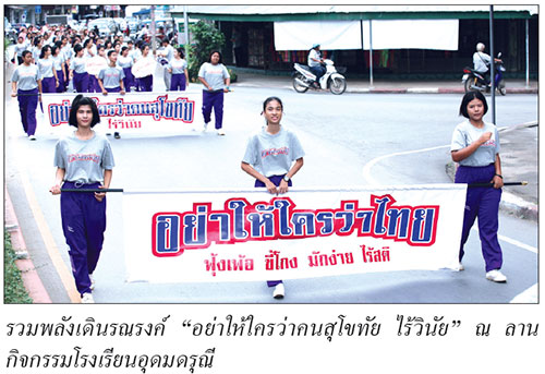 เพื่อสร้างสังคมไทยที่ยั่งยืน “เครือข่ายอนาคตไทย” มุ่งมั่นเดินหน้าขับเคลื่อนโครงการรณรงค์ระดับประเทศภายใต้ชื่อ “อย่าให้ใครว่าไทย” อย่างเต็มที่และต่อเนื่อง โดยจัดพิธีลงนามบันทึกข้อตกลงความร่วมมือในการขับเคลื่อนภารกิจเครือข่ายอนาคตไทยร่วมกัน ระหว่างมูลนิธิมั่นพัฒนา ในนามเครือข่ายอนาคตไทยกับ 36 องค์กรเครือข่ายอนาคตไทย จังหวัดสุโขทัย เพื่อร่วมมือกันรณรงค์ให้คนไทยลดละเลิก 4 พฤติกรรมเชิงลบ ได้แก่ ฟุ้งเฟ้อ ขี้โกง มักง่าย ไร้สติ โดยนำหลักปรัชญาของเศรษฐกิจพอเพียงมาใช้ในการดำรงชีวิตสร้างภูมิคุ้มกันใน 4 ด้าน คือ เศรษฐกิจ สังคม วัฒนธรรม และสิ่งแวดล้อม พร้อมกันนี้ ชาวสุโขทัยยังได้แสดงศักยภาพความพร้อมด้วยการร่วมใจรวมพลังเดินรณรงค์และปฏิญาณตน “อย่าให้ใครว่าคนสุโขทัย ไร้วินัย” โดยมีนักเรียน นักศึกษาและประชาชน เข้าร่วมกว่า 600 ชีวิต ณ ลานกิจกรรมโรงเรียนอุดมดรุณี จังหวัดสุโขทัย