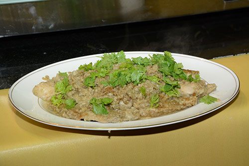 ส่วนไก่นาบกระทะ เป็นตำราที่ได้รับประทานตอนเล็กๆ ไม่ใช่พระเจ้าอยู่หัวแต่เป็นคนอื่นสอน โดยวิธีการนำอกไก่ เอาไปหมัก โดยส่วนผสมมี น้ำมันชา, ซีอิ๊ว, กระเทียม, พริกไทย รากผักชี และบรั่นดีด้วย หมักทิ้งไว้ 1 คืน ที่เราเรียกว่านาบกระทะ เพราะจะเรียกว่าไก่ทอดก็ไม่ใช่ เรานำไก่มานาบกับกระทะทั้ง 2 ข้าง จากนั้นเทไวน์ขาวลงไป รอสักพักแล้วตักใส่จาน”
