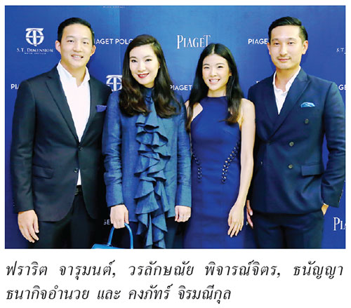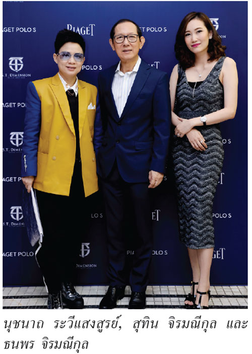 สุทิน จิรมณีกุล ประธานกรรมการบริหาร และ คงภัทร์ จิรมณีกุล รองประธานกรรมการบริหาร เอส.ที.ไดเมนชั่นวอทช์ บูติก ผู้นำเข้าและผู้จัดจำหน่ายนาฬิกาและเครื่องประดับ “เพียเจต์” (Piaget)ร่วมกับ มร.เอดูอาร์โด ทาร์ทาโล กรรมการผู้จัดการเพียเจต์ ภาคพื้นเอเชียตะวันออกเฉียงใต้และออสเตรเลีย จัดงานเปิดตัวนาฬิกา “เพียเจต์ โปโล เอส (Piaget Polo S) ณ ชั้น 6 โว้กเลานจ์ อาคารมหานคร คิวบ์