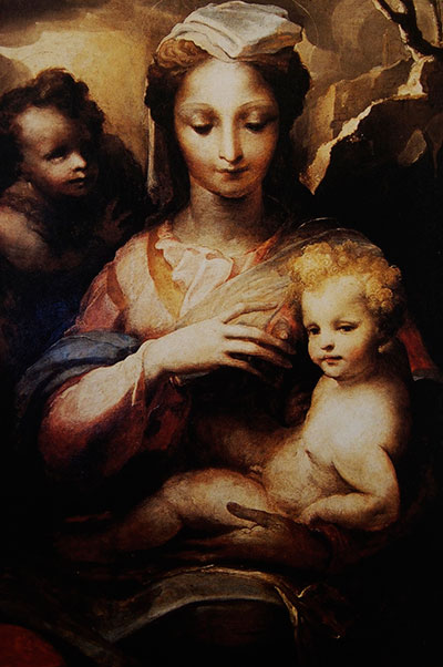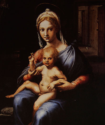 Madonna and Child ของ Giulio Pippi หรือ Giulio Romano ศิลปินและสถาปนิกอิตาลียุคเรอเนสซองส์ลูกศิษย์ของ Raphael ภาพนี้มีลักษณะพิเศษแตกต่างจากภาพเขียนแนวนี้ของศิลปินอื่นในยุคเดียวกันตรงที่ศิลปินจัดให้พระนางมารีและพระบุตรอยู่ในห้องหับมิดชิดมิใช่ในทัศนียภาพที่เป็นธรรมชาติเพื่อแสดงให้เห็นถึงความเป็นครอบครัวที่ใกล้ชิดกันหรือเสมือนมนุษย์นั่นเอง