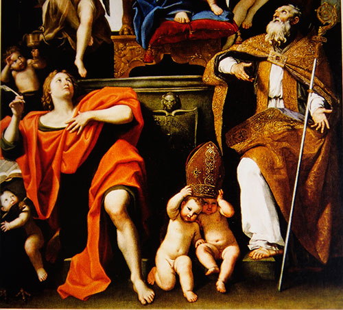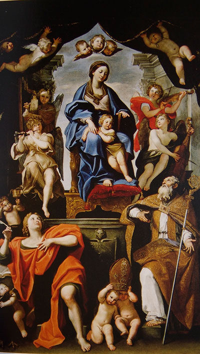 Madonna and child with SaintPetronius and Saint John the Baptist ของDomenico Zampieri ศิลปินอิตาลียุคบาโรก ภาพที่ถูกเขียนขึ้นเพื่อประดับ Santi Giovanni e Petronio dei Bolognesi นี้ถูกนำไปจัดตั้งที่ Brera มิลานในปี 1812 แม้ศิลปินจะเขียนภาพตามแนวทางศิลปะแบบบาโรก แต่การจัดวางองค์ประกอบกลับสะท้อนให้เห็นถึงอิทธิพลศิลปะแนวเรอเนสซองส์ และการใช้สีตามแนวทางศิลปะแบบ Venetian School ภาพเขียนสีนํ้ามันบนผืนผ้าใบเพื่อตกแต่งแท่นบูชาขนาดใหญ่นี้ ศิลปินวาดส่วนของนักดนตรีได้อย่างน่ารักและดูสดใส มีชีวิตชีวามากสมกับเป็นผลงานชิ้นสำคัญชิ้นหนึ่งของศิลปินเลยทีเดียว (ภาพจาก Guide theNational Gallery of Ancient Art at PalazzoBarberini)