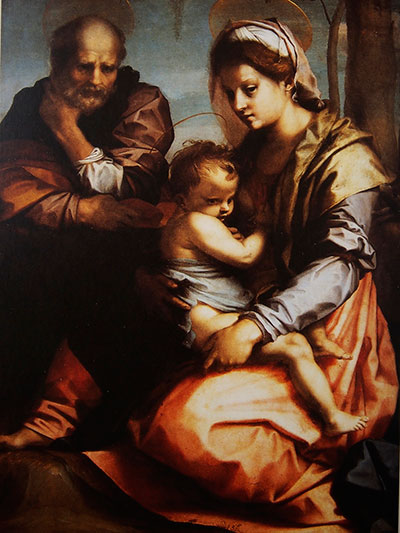 The Holy Family ของ Andrea d’ Agnolo ศิลปินอิตาลียุคเรอเนสซองส์ ภาพที่ถูกเขียนขึ้นตามคำบัญชาของ Zanobi Bracci เพื่อตกแต่งห้องสวดมนต์ใน Villa di Rovezzanoและถูกก๊อปปี้หลายครั้งนี้ได้รับอิทธิพลมาจาก Raphael อย่างเห็นได้ชัด สังเกตได้จากท่าทาง สีหน้าและรัศมีรอบศีรษะของ St.Joseph รวมทั้งหน้าตาและท่าทางของพระคริสต์ด้วย