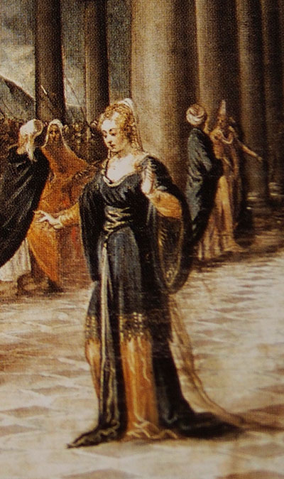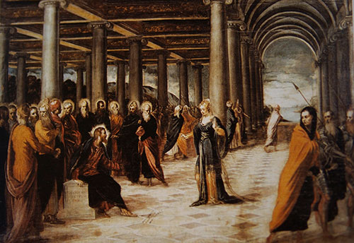 Christ and the Woman Taken in Adultery ของ Jacopo Robusti หรือ Tintorettoศิลปินอิตาลียุคเรอเนสซองส์ ภาพนี้เป็นตอนหนึ่งในพระคัมภีร์ที่ศิลปินสามารถสร้างสรรค์ผลงานได้อย่างหลากหลาย พระคัมภีร์ตอนนี้มาจากจอห์น 53:8-11 ที่พระเยซูใช้นิ้วเขียนลงบนพื้นรอบตัวหญิงที่เคยทำความผิดซึ่งปกติมักถูกหินขว้างจนตายว่า ใครผู้ไม่เคยทำผิดสามารถขว้างหินใส่หญิงคนนี้ได้เลย ประชาชนที่มายืนอยู่รอบๆ จึงเดินหนีจากไป นางจึงรอดตายได้โดยพระคุณของพระบุตรด้วยประการฉะนี้ผลงานชิ้นนี้ของศิลปินแสดงให้เห็นถึงอัจฉริยภาพของศิลปินอย่างมากตั้งแต่สีหน้าท่าทางและเสื้อผ้าของตัวละครแต่ละตัว รวมทั้งการจัดวางองค์ประกอบของภาพจนดูเป็นสามมิติได้อย่างเหลือเชื่อ
