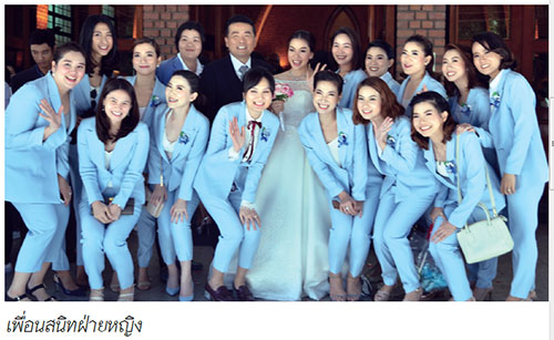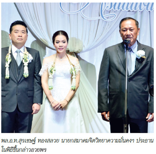 ก่อนจะจัดเลี้ยงฉลองมงคลสมรสกันต่อ ณ โรงแรม U Sathorn Bangkok เรียบง่ายเป็นกันเอง โดยบรรยากาศในงานแขกเหรื่อและเพื่อนๆ บ่าว-สาว แต่งตัวในธีมสีฟ้า มีมุมแกลเลอรี่บ่าว-สาว ให้ได้เก็บภาพแห่งความประทับใจ เมื่อเข้าสู้พิธีการ พล.อ.ท.สุรเชษฐ์ ทองสลวย นายกสมาคมจิตวิทยาความมั่นคงแห่งประเทศไทย ประธานในพิธีขึ้นกล่าวอวยพรให้ทั้งสองครองชีวิตคู่ร่วมกันอย่างมีความสุข ก่อนจะเกี่ยวก้อยตัดเค้กมงคลมอบให้ผู้ใหญ่แทนคำขอบคุณปิดท้ายวันแห่งความสุขอย่างชื่นมื่น
