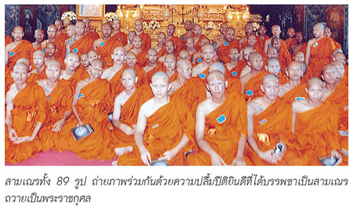ด้วยสำนึกในพระมหากรุณาธิคุณอย่างหาที่สุดมิได้ ศาลเยาวชนและครอบครัวกลาง มูลนิธิสถานฝึกและอบรมเด็กและเยาวชนชายสิรินธร โรงพยาบาลตุลาการเฉลิมพระเกียรติ และพุทธสถานตุลาการเฉลิมพระเกียรติ จึงได้จัดบรรพชาสามเณร 89 รูป โดยนำเยาวชนในส่วนของโรงพยาบาลตุลาการเฉลิมพระเกียรติ สำนักงานศาลยุติธรรม และจากมูลนิธิสถานฝึกและอบรมเด็กและเยาวชนชายสิรินธร ซึ่งเด็กและเยาวชนเหล่านี้ได้ยื่นความจำนงขอเข้าร่วมบรรพชาด้วยความสมัครใจและเต็มใจด้วยกันทุกคน และพร้อมที่จะปฏิบัติธรรม ปฏิบัติจิต รักษาศีลและเจริญจิตภาวนา เข้าถวายตัว และเข้ารับการบรรพชาเป็นสามเณรเพื่อถวายเป็นพระราชกุศล และน้อมรำลึกในพระมหากรุณาธิคุณของพระบาทสมเด็จพระปรมินทรมหาภูมิพลอดุลยเดช ณ พระอุโบสถวัดบวรนิเวศราชวรวิหารแห่งนี้ ระหว่างวันที่ 1 ธันวาคม ถึง 15 ธันวาคม 2559 รวมระยะเวลาการบรรพชา 15 วัน