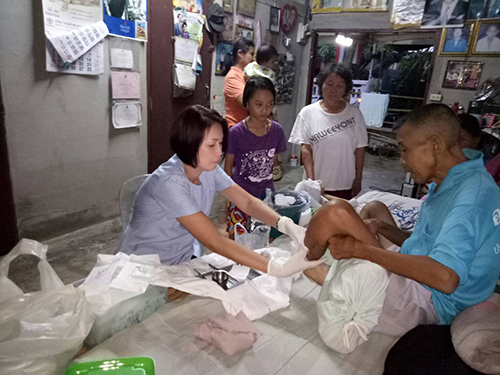 ญาดา ชุมนุมพร้อม พยาบาลในโครงการ “จีเอสเค พยาบาลเพื่อชุมชน รุ่นที่ 1” จบจากวิทยาลัยพยาบาลบรมราชชนนี จ.พะเยา ปัจจุบันเป็นพยาบาลอยู่โรงพยาบาลเชียงคำ จ.พะเยา เล่าว่า “เป็นพยาบาลมา 15 ปี ได้เห็นความลำบากทุกข์ยากของผู้ป่วยมากมาย เมื่อเรามีโอกาสที่ดีกว่าคนอื่น ก็อยากจะช่วยเหลือคนป่วยอย่างเต็มที่ เลยเปิด “คลินิกฮักบ้านเกิด” เพื่อให้การพยาบาลเบื้องต้นแก่ชาวบ้านที่อยู่ห่างไกล เนื่องจากหมู่บ้านอยู่ไกลโรงพยาบาลมาก การเดินทางก็ลำบาก เช่น คนไข้ที่ต้องทำแผลต่อเนื่องหรือ คนไข้นอนติดเตียง ไม่มีญาติ หรือในบางรายพี่เองก็จะเดินทางไปเยี่ยมถึงที่บ้านด้วย ไม่ได้คิดเงิน อย่างน้อยพี่ก็เป็นส่วนหนึ่งที่จะได้ทำตามพระราชปณิธานของพระบาทสมเด็จพระปรมินทรมหาภูมิพลอดุลยเดช ที่ต้องการให้คนไทยมีความเป็นอยู่ที่ดีขึ้น พี่ก็เริ่มจากดูแลสุขภาพของคนหมู่บ้านเล็กๆ ที่พี่ได้อยู่อาศัยมาจนโต นอกจากนี้ ก็ยังมีงานวิทยากรจิตอาสา ให้ความรู้ด้านสุขภาพผ่านรายการวิทยุชุมชนด้วย”