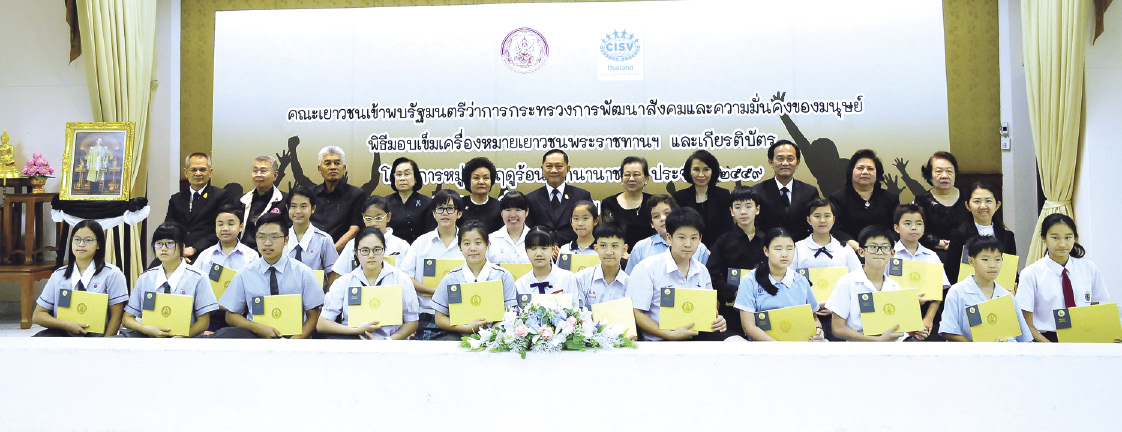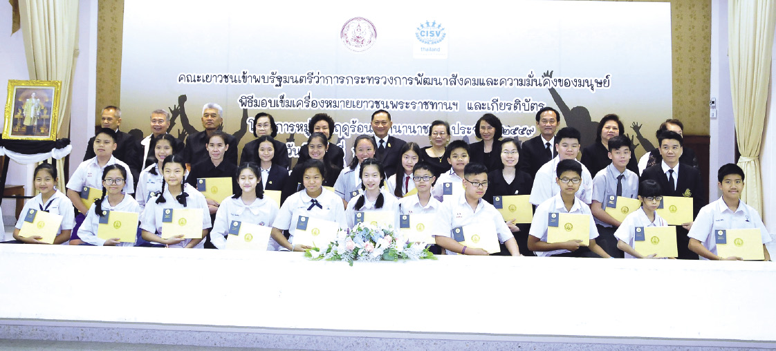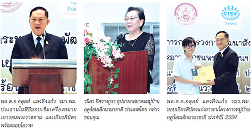 พล.ต.อ.อดุลย์ แสงสิงแก้ว รัฐมนตรีว่าการกระทรวงการพัฒนาสังคมและความมั่นคงมนุษย์ (รมว.พม.) เป็นประธานในพิธีมอบเข็มเครื่องหมายเยาวชนพระราชทานและเกียรติบัตร พร้อมมอบโอวาทแก่คณะผู้นำเด็กและเยาวชน โครงการหมู่บ้านฤดูร้อนเด็กนานาชาติ ประจำปี 2559 โดยมี วนิดา อิศรางกูร ณ อยุธยา อุปนายก ผู้แทน กุณฑลา สันติประภพ นายกสมาคมหมู่บ้านฤดูร้อนเด็กนานาชาติ ประเทศไทย นำคณะผู้นำเยาวชนคณะกรรมการบริหารสมาคมฯ และผู้ปกครอง เข้าร่วมงานพร้อมกล่าวขอบคุณประธานในพิธี ณ หอประชุมกรมกิจการเด็กและเยาวชน เมื่อวันอังคารที่ 6 ธันวาคม 2559 โดยโครงการหมู่บ้านฤดูร้อนเด็กนานาชาติ