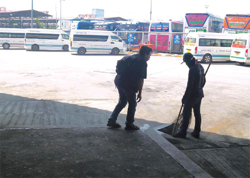 “กวาดเล็ก คือ คนทยอยเดินกวาดพื้นตรงที่จอดรถทัวร์ ส่วนกวาดใหญ่ทุกจุดจะทำในช่วงค่ำหรือช่วงดึกไปแล้ว คนทำความสะอาดจะระดมกันมากวาดไล่เป็นทางยาวเลย ที่ต้องทำแบบนี้เพราะช่วงกลางวันทำไม่ได้ คนนั่งรอรถกันเยอะ ถ้ากวาดใหญ่จะรบกวนผู้โดยสาร”