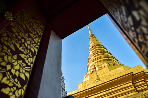 “จุดที่ 2...องค์พระธาตุแช่แห้ง” ที่สูงถึง 55.5 เมตร มีสีเหลืองอร่ามเพราะบุด้วยแผ่นทองเหลือง ลักษณะของเจดีย์ทรงระฆัง ส่วนฐานทำเป็นฐานหน้ากระดานสี่เหลี่ยมขนาดใหญ่ รองรับฐานบัวลูกแก้ว ย่อเก็จ ถัดขึ้นไปเป็นฐานหน้า กระดานสี่เหลี่ยมและแปดเหลี่ยมซ้อนลดหลั่นกัน 3 ชั้น องค์ระฆังมีขนาดเล็ก บัลลังก์ทำเป็นแท่นสี่เหลี่ยม ย่อเก็จ ฐานหน้ากระดานกลมเป็นกระดานสี่เหลี่ยมและแปดเหลี่ยม และชั้นบัวคว่ำเหนือฐานแปดเหลี่ยม ตกแต่งคล้ายกลีบบัว หรือลายใบไม้ ซึ่งได้รับอิทธิพลจากศิลปะพม่า