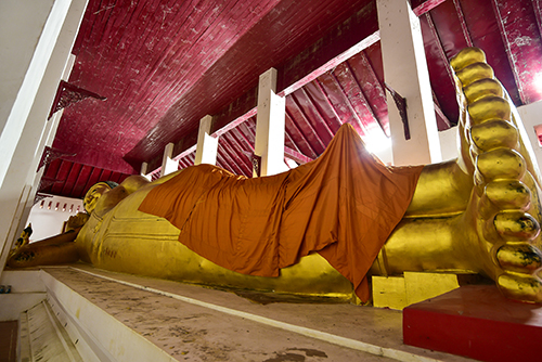 “จุดที่ 5...วิหารพระพุทธไสยาสน์” เมื่อเดินผ่านเส้นทางนาคขึ้นไป ด้านซ้ายมือก่อนถึงองค์พระธาตุจะมีวิหารพระพุทธไสยาสน์ที่ภายในประดิษฐานพระนอนองค์สีทองอร่าม ยาว 14 เมตร สูง 2 เมตร และยังมีพระพุทธรูปปางมารวิชัยเก่าแก่ สร้างปี 2129 นับเป็นอีกหนึ่งสถานที่ศักดิ์สิทธิ์ที่ผู้คนนิยมกราบไหว้บูชา