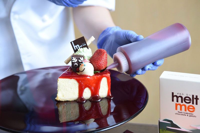 เมนูแรก เมลท มี ขอเสนอ “TheHappiness Cheesecake” เลือกนามะช็อกโกแลตและช็อกโกแลตพราลีนสอดไส้สุดคิ้วท์ที่มีให้เลือกกว่า 30 แบบ ตกแต่งลงบนชีสเค้กที่เตรียมไว้ เพิ่มความสดชื่นด้วยสตรอเบอร์รี่สด บีบวิปปิ้งครีมให้ฟูแล้วตกแต่งด้วยเวเฟอร์แท่ง ราดซอสสตรอเบอร์รี่ให้ฉ่ำ แล้วโรยไอซิ่งแบบปุยหิมะโปรยปราย เท่านี้คนรับก็ยิ้มแก้มปริ