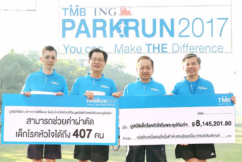 วิ่งเพื่อหัวใจตนเอง และวิ่งเพื่อมอบหัวใจที่แข็งแรงแก่เด็กผู้ป่วย ล่าสุด ทีเอ็มบี และ ไอเอ็นจี แบงก์กิ้ง เอเชีย จัดกิจกรรมเดิน-วิ่งมินิมาราธอนการกุศล “TMB I ING ParkRun 2017” (ทีเอ็มบี ไอเอ็นจี พาร์ครัน 2017) ประสบการณ์การเดิน-วิ่งในเส้นทาง 3 สวนสวย คือ สวนจตุจักร สวนวชิรเบญจทัศ(สวนรถไฟ) และสวนสมเด็จพระนางเจ้าสิริกิติ์ ภายใต้คอนเซ็ปต์ “YOU can..Make THE Difference” การวิ่งที่มีความหมาย ไม่เพียงเปลี่ยนชีวิตคุณให้ดีขึ้น แต่ยังช่วยเปลี่ยนชีวิตเด็กผู้ป่วยโรคหัวใจ ด้วยการสร้างเพจระดมเงินบริจาค รวมรายได้จากการขายบัตร เงินบริจาคจากเพจและเงินสมทบจากทีเอ็มบีในครั้งนี้รวม 8,145,201.80 บาท มอบแก่มูลนิธิเด็กโรคหัวใจ ในพระอุปถัมภ์ของสมเด็จพระเจ้าพี่นางเธอ เจ้าฟ้ากัลยาณิวัฒนา กรมหลวงนราธิวาสราชนครินทร์ เพื่อใช้ในการผ่าตัดเด็กโรคหัวใจ 407 คน