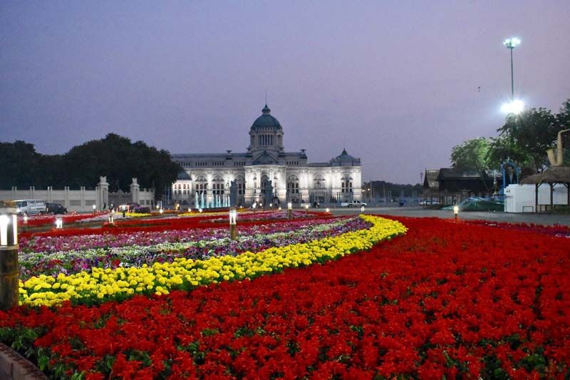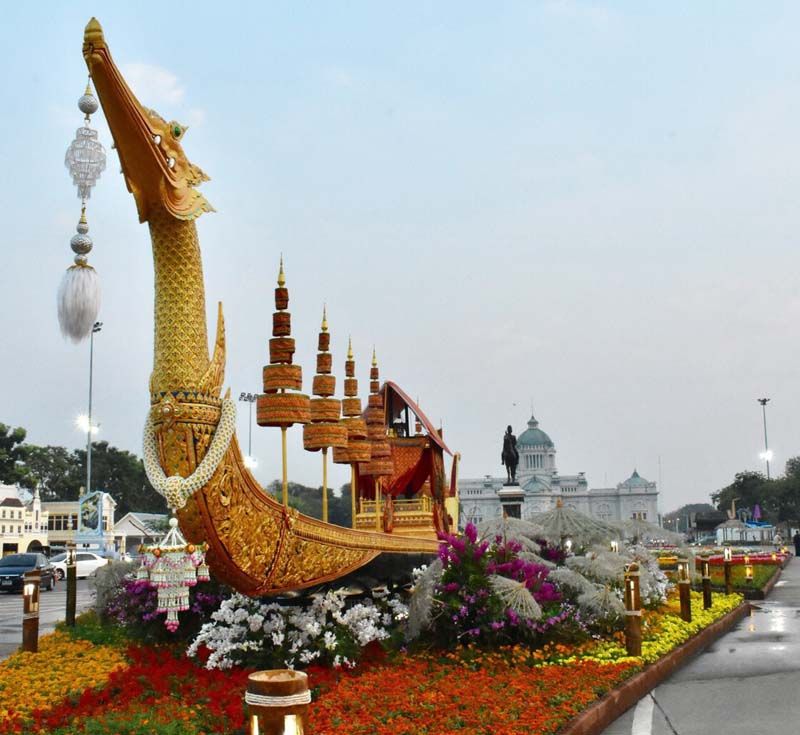 ซึ่งหนึ่งในไฮไลท์ของงานอยู่บริเวณหน้าพระลานพระราชวังดุสิต โดดเด่นด้วยเรือสุพรรณหงส์จำลองที่ประดับด้วยดอกกล้วยไม้และดอกไม้นานาพันธุ์ ความยาวขนาด 25 เมตร ที่กรมศิลปากรจัดสร้างขึ้น โดยประดับร่วมกับผ้าไหมทอง และโดยรอบพระบรมรูปทรงม้า ประดับด้วยแปลงดอกไม้ขนาดใหญ่มีดอกไม้เมืองหนาวบานสะพรั่งกว่า 30 ชนิด อาทิ บานชื่นหนู ดาวกระจาย ดาวเรือง คอสมอส แววมยุรา ผีเสื้อ กล้วยไม้สกุลหวาย เป็นต้น เน้นสีสันสดใส ตัดสีสวยงาม เช่น สีแดง สีส้ม สีเหลือง สีชมพู ซึ่งใช้สีชมพูสีประจำพระองค์พระบาทสมเด็จพระจุลจอมเกล้าเจ้าอยู่หัว รัชกาลที่ 5 และสีเหลืองประจำพระองค์สมเด็จพระเจ้าอยู่หัว รัชกาลที่ 10 มาจัดเป็นสวนสวยงาม โดยใช้ต้นไม้รวมทั้งงานกว่า 2 แสนต้น