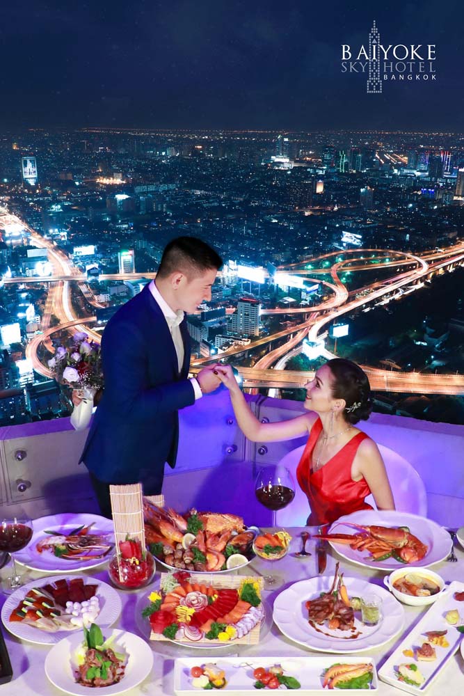 โรงแรมใบหยก สกาย นำเสนอดินเนอร์หรูสุดอลังการแบบพรีเมียมบุฟเฟ่ต์ นำโดย แคนนาเดียนล็อบสเตอร์ ตัวโตเนื้อแน่น, กั้งกระดาน,สเต๊กซี่โครงแกะนิวซีแลนด์, เนื้อเซอร์ลอยด์ออสเตรเลีย, กุ้งแม่น้ำ, ปูม้า, หอยแมลงภู่นิวซีแลนด์ และอาหารนานาชาติอื่นๆ อีกกว่า 100 รายการที่ให้บริการแบบไม่จำกัด พร้อมรับพวงกุญแจ Love Lock in the Skyในราคาท่านละ 1,650 บาทสุทธิ ที่ห้องอาหาร Crystal Grill พิเศษรับส่วนลด 10% พร้อมรับสิทธิเลือกที่นั่งพิเศษ เมื่อซื้อบัตรก่อนวันจันทร์ที่ 12 ก.พ. หรือในราคาท่านละ 2,800 บาทสุทธิ ที่ห้องอาหาร Bangkok Balcony (Sky Box) เฉพาะวันพุธที่ 14 ก.พ. สอบถามและสำรองที่นั่งโทร.02-6563939