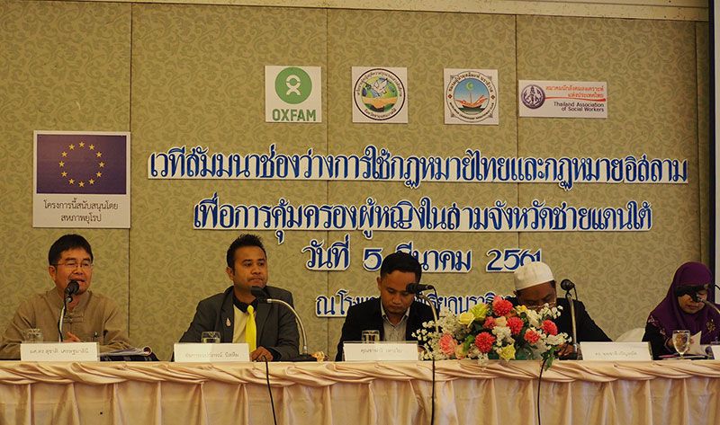 องค์การอ็อกแฟม เครือข่ายผู้หญิงยุติความรุนแรงแสวงสันติภาพจังหวัดชายแดนใต้ ชมรมผู้นำมุสลีมะห์จังหวัดนราธิวาส และสมาคมนักสังคมสงเคราะห์แห่งประเทศไทย จัดสัมมนาช่องว่างการใช้กฎหมายไทยและกฎหมายอิสลามเพื่อคุ้มครองสิทธิผู้หญิงในจังหวัดชายแดนใต้ ผลักดันอิสลามกลางประจำจังหวัด ดาโต๊ะ และรัฐ ทำงานด้วยกันเพื่อให้ผู้หญิงได้รับความยุติธรรม และปรับหลักการทางศาสนาให้เหมาะสมกับยุคปัจจุบัน