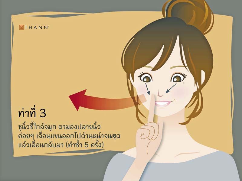 เวิร์กช็อปเริ่มด้วยการแนะนำท่านวดบริหารเพื่อชะลอการเกิดริ้วรอย และความอ่อนล้าของดวงตา ควบคู่กับ “เอจ อินเวอร์ชั่น อายเซรั่ม” (Age Inversion Eye Serum) เซรั่มเนื้อบางเบาอ่อนโยนต่อผิวรอบดวงตา พัฒนามาเพื่อรับมือกับปัญหาความร่วงโรยแห่งวัยโดยเฉพาะ เริ่มจากท่าที่ 1 กะพริบตาถี่ๆ 5 ครั้ง สลับกับกะพริบตาปรกติ 2 นาทีท่าที่ 2 วาดสี่เหลี่ยมผืนผ้าตามเข็มนาฬิกา 5 รอบ ด้วยดวงตาในอากาศ 5 รอบ ทำซ้ำในอีกทิศทาง ท่าที่ 3 ชูนิ้วชี้ใกล้จมูก ตามองปลายนิ้ว ค่อยๆ เลื่อนแขนออกไปด้านหน้าจนสุด แล้วเลื่อนกลับมา ทำซ้ำ 5 รอบ ท่าที่ 4 วาดเลข 8 ในแนวนอนตามเข็มนาฬิกาด้วยดวงตาในอากาศ 5 รอบ และทำซ้ำในทิศทางตรงกันข้าม ท่าที่ 5 ชูนิ้วโป้งไปข้างหน้าจนสุด มองที่ปลายนิ้ว แล้วค่อยลดแขนลงทำมุม 45 องศา แล้วยกกลับขึ้นมา ทำซ้ำ 5 รอบ และท่าที่ 6 ถูฝ่ามือทั้งสองข้างจนรู้สึกอุ่น แล้วนำไปประคบที่ดวงตาทั้งสองข้าง