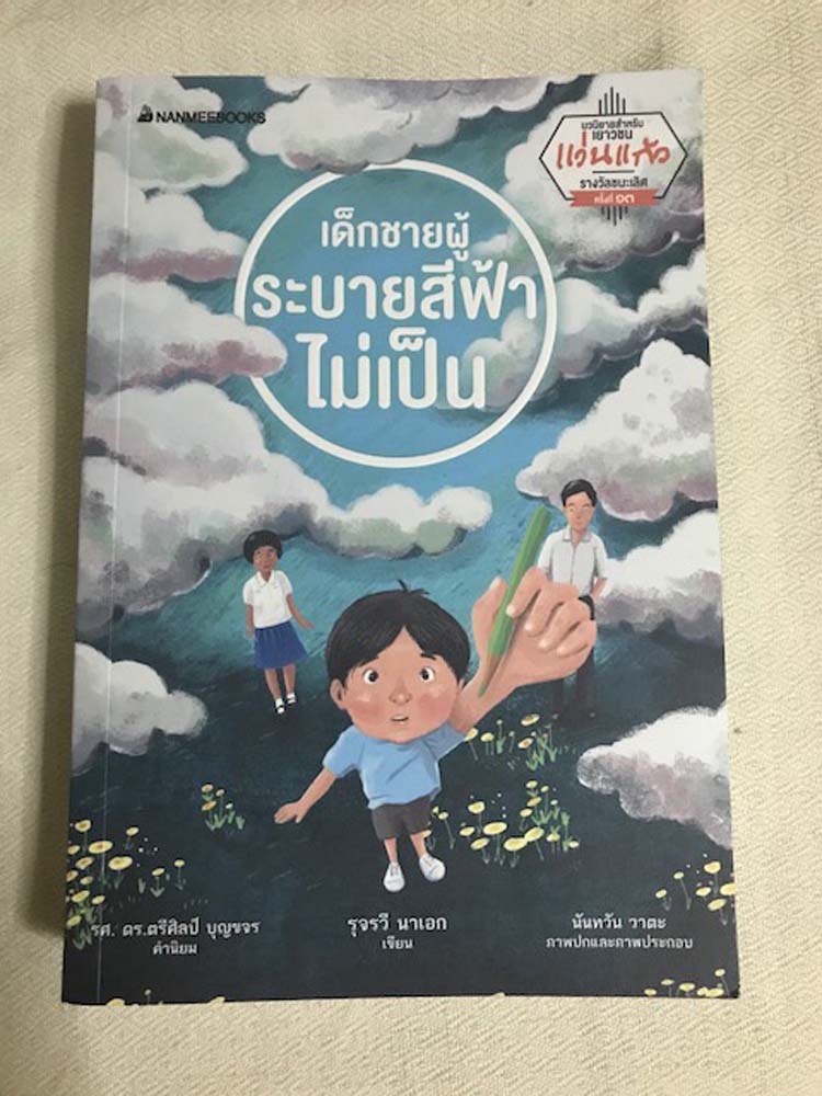 นวนิยายสำหรับเยาวชน รางวัลชนะเลิศรางวัลแว่นแก้ว ครั้งที่ 13 เด็กชายผู้ระบายสีฟ้าไม่เป็น เป็นเรื่องราวของเด็กตาบอดสีคนหนึ่งที่รักการวาดรูป ที่ถูกเพื่อนล้อเลียนและกลั่นแกล้งจนไม่กล้าวาดรูปอีก แม่เสียชีวิต พ่อจมอยู่กับความทุกข์ แต่พอขึ้นชั้นป.4 ได้พบกับครูศิลปะใจดีและให้กำลังใจ เขาจึงกลับมาวาดรูปอีกครั้ง และส่งเข้าประกวด เพื่อสนองความชอบตัวเองและจะมุ่งหวังคืนรอยยิ้มให้พ่อในเรื่องจะสะท้อนปัญหาครอบครัวไทยในหลายรูปแบบ นำเสนอแนวคิดบางครั้งผู้ใหญ่ก็แก้ปัญหาให้เด็กไม่ได้ เด็กสามารถแก้ปัญหาตัวเองและให้ผู้ใหญ่ได้ หนังสือเล่มนี้จำหน่ายเล่มละ 185 บาท