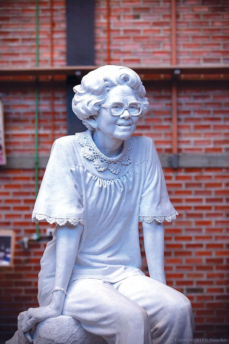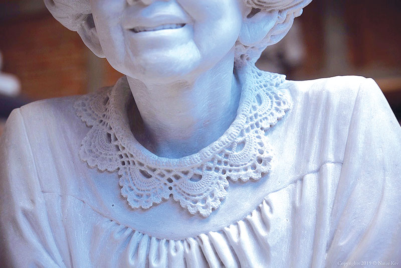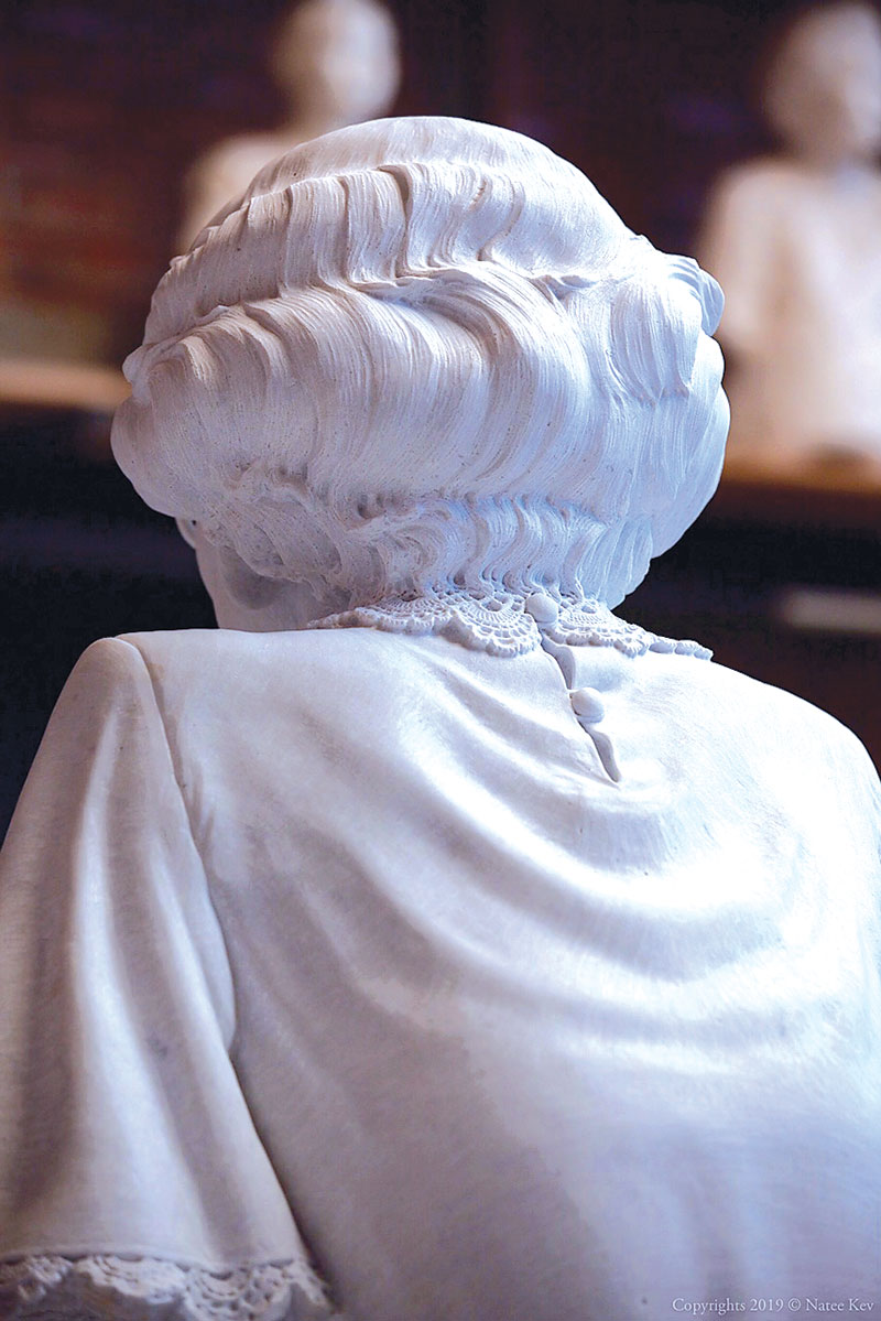 คือเราต้องดูลักษณะทางกายภาพของตัววัสดุที่นำมาใช้ก่อน สมมุติถ้าเป็นหินทราย เนื้อมันจะร่วนๆหยาบๆ เพราะฉะนั้นการใส่รายละเอียดลงไปบนเนื้อหินจะต่างกันมาก อย่างที่เราเห็นอยู่นี้คือ รายละเอียดของคอเสื้อ(ฉลองพระองค์) ที่ทำจากผ้าลูกไม้ การจะแกะสลักให้ออกมาเสมือนจริง เหมือนกับเราเห็นผ้าลูกไม้จริงๆ นั้น เราต้องทำบนหินอ่อนเนื้อดีเท่านั้น ถ้าเป็นหินชนิดอื่นแล้ว ไม่สามารถทำรายละเอียดเช่นนี้ได้อย่างแน่นอน โดยเฉพาะกับเนื้อของหินทราย ถึงแม้อาจจะพอทำได้ แต่ก็ไม่สามารถให้รายละเอียดได้มากเท่ากับเนื้อของหินอ่อน แล้วถ้ายิ่งเป็นรายละเอียดอื่นๆ เช่น ผิวหนัง รอยย่นบนพระพักตร์ เป็นต้น ยิ่งทำได้ยากมาก หรือทำไม่ได้เลย คือไม่สามารถใส่รายละเอียดได้อย่างเด็ดขาด เพราะเนื้อหินทรายจะคล้ายๆ กับน้ำตาลทรายก้อนที่เราใส่กาแฟ มันจะร่วนๆ ไม่สามารถแต่งขอบให้คมชัดได้มาก เพราะยิ่งขัดเพื่อจะให้คมก็จะยิ่งแตก เพราะเนื้อหินทรายเกาะกันแบบหลวมๆ เท่านั้นความแน่นไม่เหมือนกับหินอ่อน อย่างพระรูปองค์นี้ของสมเด็จย่า ผมขออนุญาตใช้คำธรรมดานะครับ เสื้อ หรือฉลองพระองค์จะมีรอยจีบ มีรอยของเนื้อผ้าที่ดูเสมือนรอยจีบ รอยยับ นี่คือรายละเอียดที่ปรากฏบนหินอ่อนได้เป็นอย่างดี หินอ่อนจากคาร์ราราถูกยอมรับว่าดีที่สุดในโลก เหมาะกับการแกะสลักในงานที่ต้องการให้ผลงานออกมาดูเสมือนสิ่งมีชีวิตจริง เพราะเนื้อหินละเอียดพอเหมาะผลึกคริสตัลเป็นผงเล็กมาก อัดตัวแน่น ไม่ร่วน