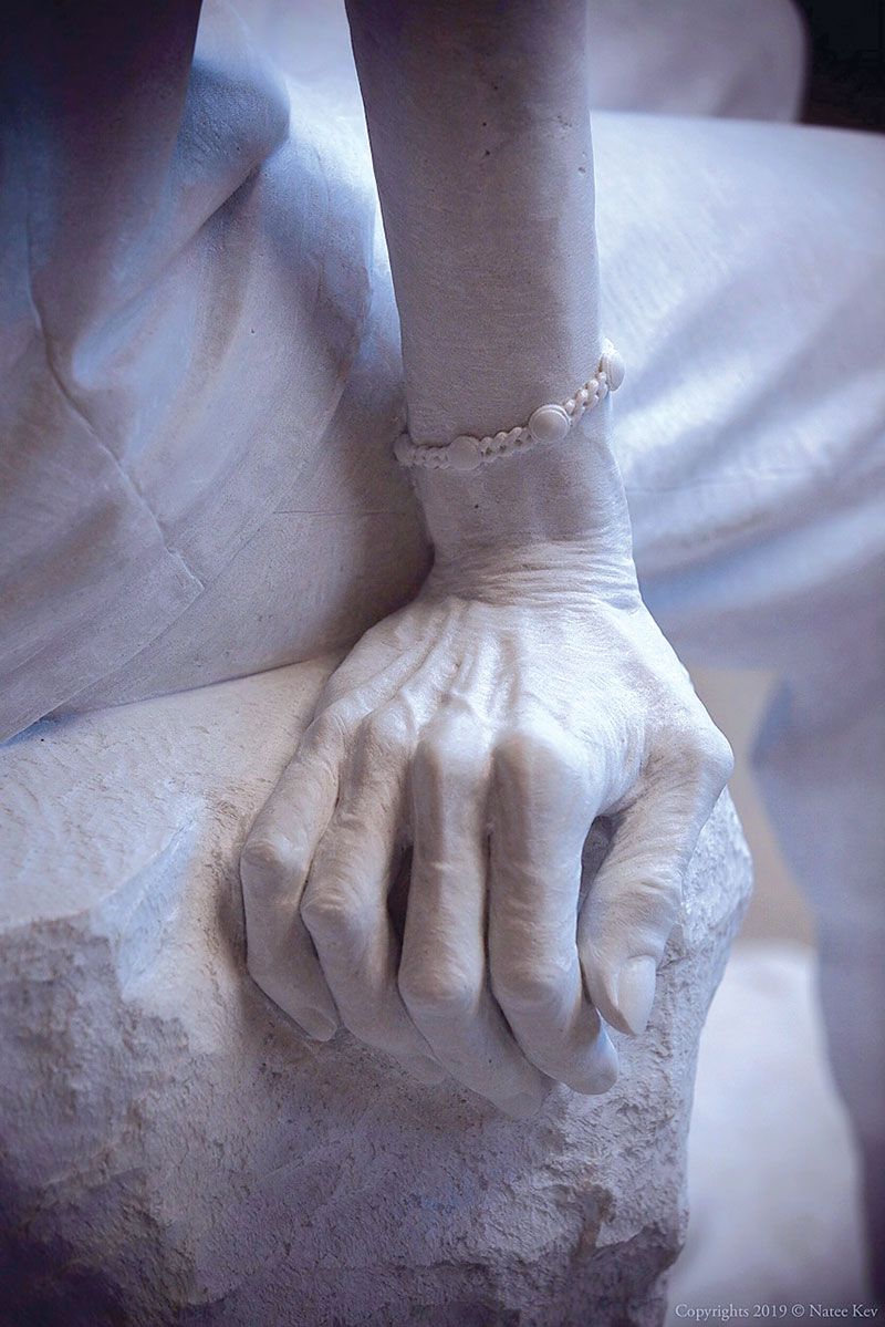 l ผมมีคำถามว่า เวลาเราได้ดูงานแกะสลักหินอ่อนระดับโลก เช่น รูปแกะสลักเดวิด ของไมเคิลแองเจโล หรืองานประติมากรรมรูปผู้หญิงที่ดูเสมือนเปลือยกาย แต่ดูเสมือนมีผ้าบางๆ ห่มคลุมตัวไว้ แล้วเห็นริ้วของผ้า หรือเห็นเส้นเลือดที่มือของเดวิด งานระดับโลกแบบนั้นเขาทำได้อย่างไรครับ เพราะดูเสมือนจริงมาก ซึ่งก็ไม่ต่างไปจากพระรูปของสมเด็จย่าที่คุณนทีกำลังแกะสลักอยู่นี้