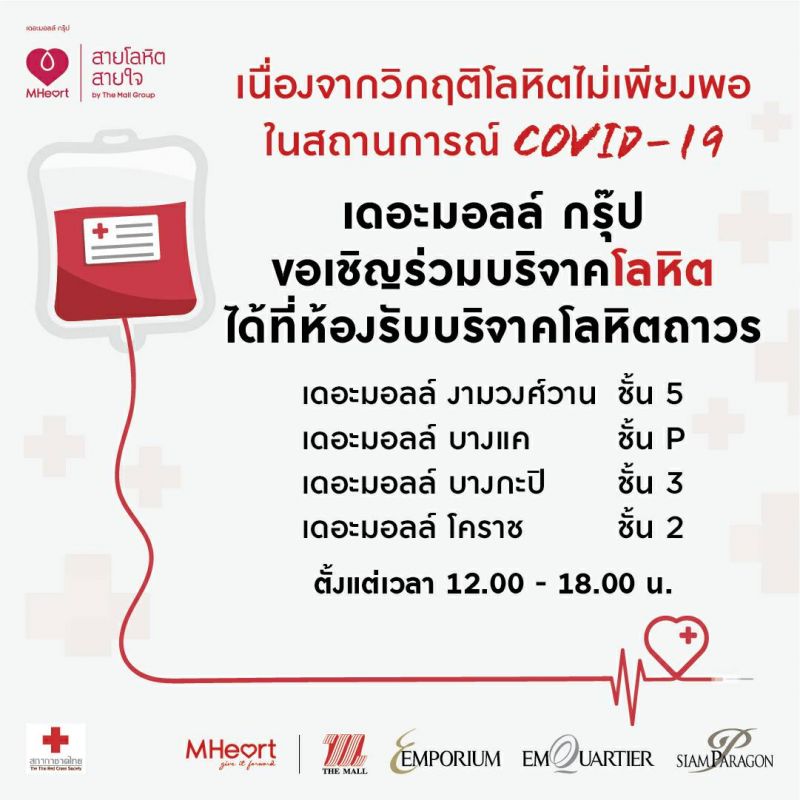 บริษัท เดอะมอลล์ กรุ๊ป จำกัด ร่วมกับ ศูนย์บริการโลหิตแห่งชาติ สภากาชาดไทย เชิญชวนคนไทยบริจาคโลหิต สู้วิกฤตโควิด-19 หลังสถานการณ์การแพร่ระบาดของเชื้อไวรัสโควิด-19 ส่งผลให้ปริมาณโลหิตในคลังลดลง พร้อมสร้างความมั่นใจว่าห้องรับบริจาคโลหิตถาวร (Fixed Station) ในกลุ่มเดอะมอลล์ กรุ๊ป ทุกแห่ง เป็นสถานที่ปลอดภัย ด้วยมาตรการป้องกันความปลอดภัยขั้นสูงสุด “เพราะเรา ห่วงใย ใส่ใจ ทั้งผู้ให้และผู้รับ”