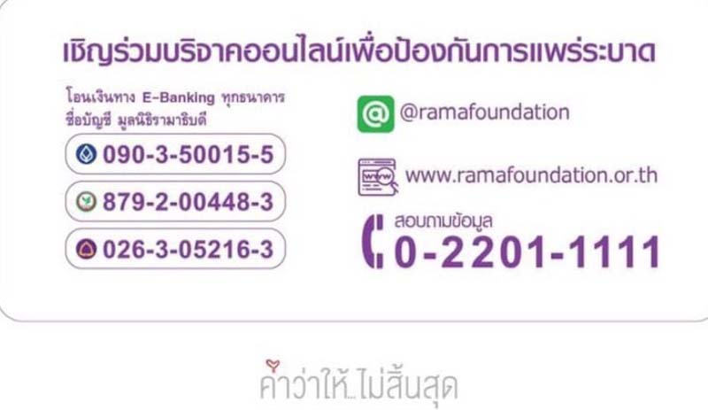 คณะแพทยศาสตร์ โรงพยาบาลรามาธิบดี และมูลนิธิรามาธิบดีฯโครงการป้องกันและช่วยเหลือสถานการณ์แพร่ระบาดของโควิด-19เพื่อสร้างความพร้อมและความคล่องตัวในการบริหารจัดการด้านต่างๆ สำหรับรักษาผู้ป่วยโควิด-19 บริจาคผ่านช่องทาง on line ได้ที่ ธนาคารกรุงเทพ หมายเลขบัญชี 090-3-50015-5ธนาคารกสิกรไทย หมายเลขบัญชี 879-2-00448-3 และธนาคารไทยพาณิชย์ หมายเลขบัญชี026-3-05216-3 สามารถสอบถามข้อมูลเพิ่มเติมที่โทรศัพท์หมายเลข02-2011111