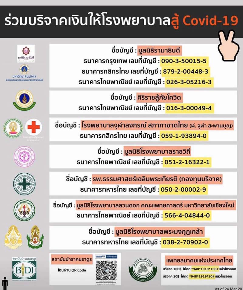 และ #Gowith20 ที่เป็นการเชิญชวนผ่าน social media ที่ผู้คนพบเห็นมากที่สุดในเวลานี้ โดยขอให้คุณโอนเงิน 20 บาท เพื่อนำไปช่วยยับยั้งวิกฤติโควิด-19 ในประเทศไทย คุณสามารถโอนเงินไปที่ธนาคารกรุงเทพ หมายเลขบัญชี 142 3103 033 โดยโครงการนี้ขอให้คุณช่วยเชิญชวนเพื่อนๆ ของคุณให้ร่วมบริจาคคนละ 20 บาทด้วย โดยขอให้เพื่อน1 คนชวนเพื่อนอีก 20 คน ให้บริจาค แล้วเพื่อนแต่ละคนก็ไปชวนเพื่อนอีก20 คน ให้ช่วยบริจาค โดยทำเป็นเสมือนลูกโซ่ไปเรื่อยๆ