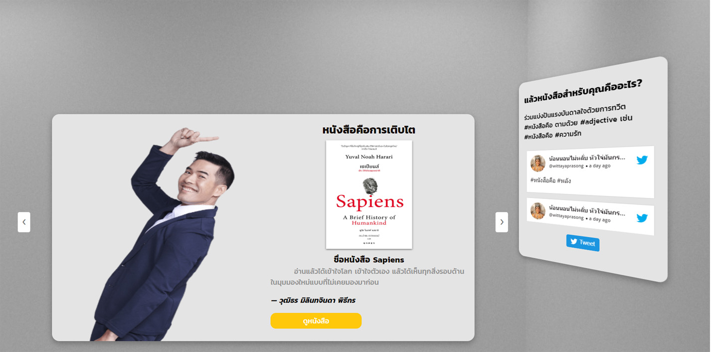 นิทรรศการสร้างแรงบันดาลใจ...หนังสือดีมีชีวิต เพราะหนังสือคือส่วนหนึ่งของช่วงเวลาที่ดีในชีวิตมนุษย์ เป็นมากกว่าตัวอักษร หรือข้อมูลที่พิมพ์ลงบนกระดาษ เป็นแรงบันดาลใจที่ทำให้ใครหลายคนอยากเปลี่ยนชีวิต โดยนิทรรศการจะแบ่งออกเป็น 2 ส่วน ดังนี้ ส่วนแรก Emotion Collection เพราะหนังสือคือ “ความสุข” ที่อาจเกิดจากการได้อ่านเรื่องราวดีๆ ได้รับมุมมองที่เป็นบวก ได้เห็นคนอื่นมีความสุข ก็ทำให้เรารู้สึกได้ถึงความสุข ซึ่งอาจมาจากหนังสือธรรมะ บทความเกี่ยวกับความสุข หรือนิยายที่อ่านแล้วยิ้มมีความสุข