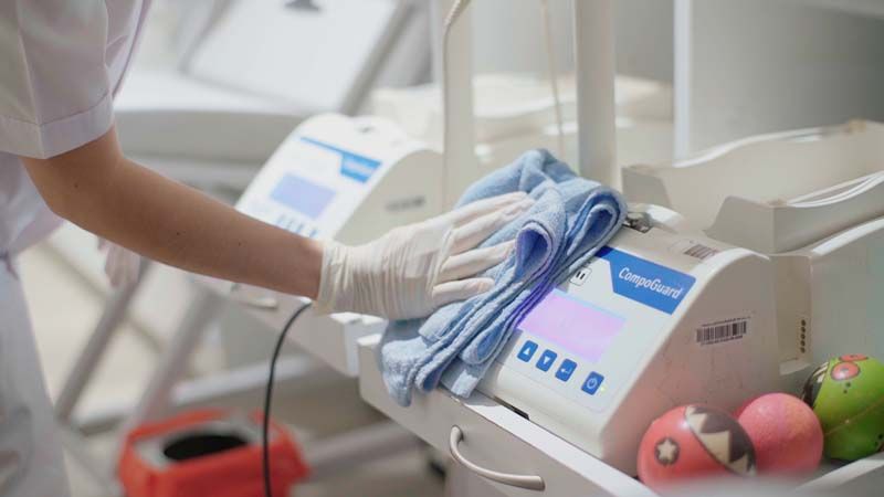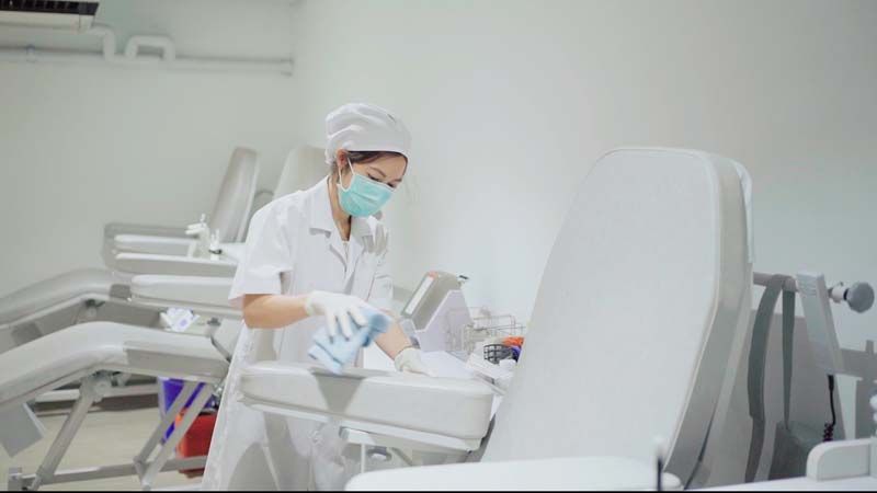 ทำความสะอาดพื้นและอุปกรณ์ภายในห้องรับบริจาคโลหิตด้วยน้ำยาฆ่าเชื้อ