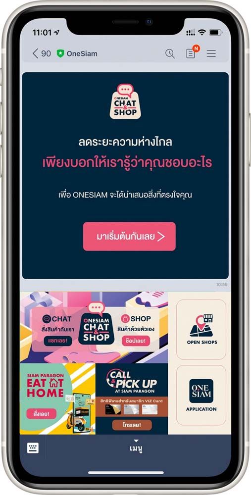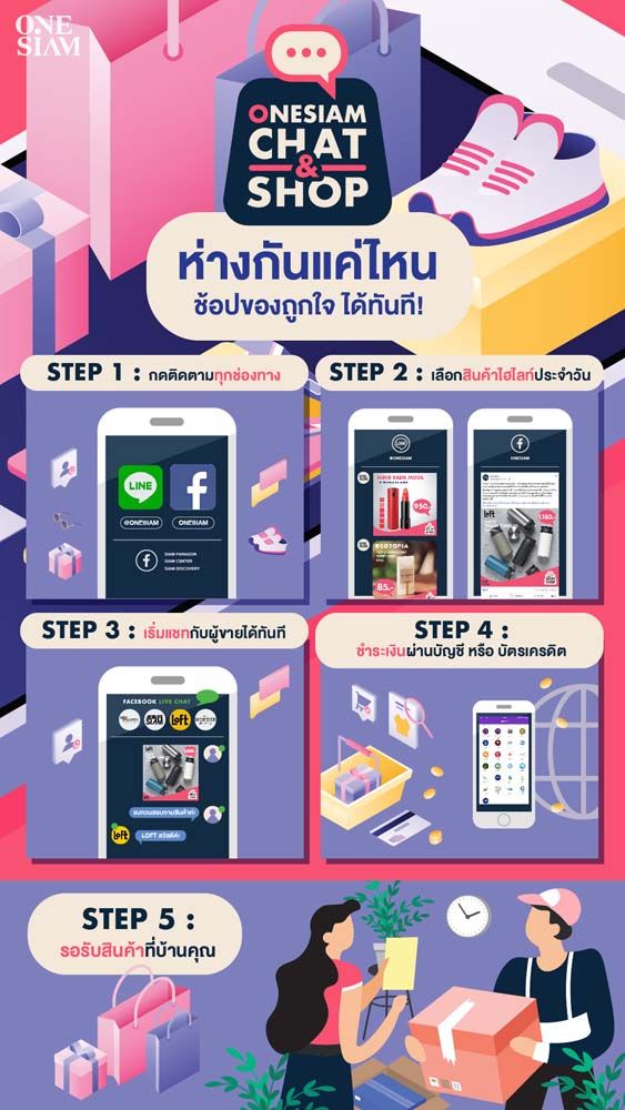 OneSiam โกลบอลเดสติเนชั่นที่ผนึกกำลัง 3 ศูนย์การค้าทั้ง สยามพารากอน สยามเซ็นเตอร์สยามดิสคัฟเวอรี่ ชวนช็อปให้สนุกกับบริการ “OneSiam Chat& Shop” (วันสยามแชทแอนด์ช็อป) ประสบการณ์ช็อปปิ้งใหม่ล่าสุด ไม่ว่าจะอยู่ในระหว่างช่วงเวิร์ก ฟอร์ม โฮม ช่วงเวลาที่ร่างกายต้องการช็อปเทอราปีหรือต้องการเพื่อนคุยเพื่อนแชทเรื่องช็อปปิ้ง เพียงหยิบโทรศัพท์แล้วเปิดเข้า LINE OA OneSiam แล้วพูดคุยสั่งสินค้ากับบริการ OneSiam Chat &Shop ได้ทันที