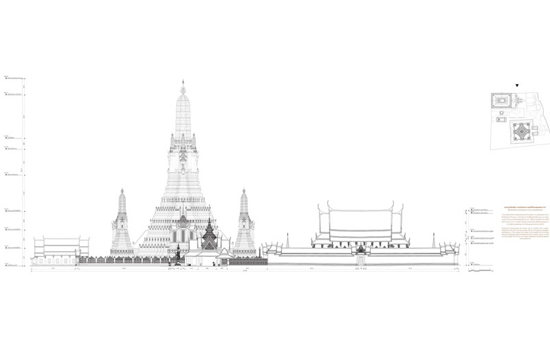 โดยจุดเด่นคือ การนำเสนอเกี่ยวกับการสำรวจรังวัด ซึ่งเป็นการผสมผสานระหว่างมิติทางเรขาคณิต ผ่านองค์ประกอบของเส้นสายในเชิงลวดลาย รูปแบบ รูปทรง ทำให้ได้แบบสถาปัตยกรรมซึ่งมีความสวยงามสมจริง ถ่ายทอดลงสู่แบบในกระดาษด้วยวิธีการอิงมาตราส่วนตามระบบสากล เกิดเป็นฐานข้อมูลสำคัญทางประวัติศาสตร์สถาปัตยกรรม ซึ่งจะก่อให้เกิดประโยชน์ทั้งในด้านการศึกษาสถาปัตยกรรม รวมถึงการบูรณปฏิสังขรณ์และการอนุรักษ์งานสถาปัตยกรรมของพระอารามแห่งนี้ต่อไปในอนาคต หนังสือฯ เล่มนี้จัดทำสองภาษาทั้งไทยและอังกฤษ เพื่อให้ชาวต่างชาติสามารถชื่นชมในสถาปัตยกรรมไทยได้เช่นกัน