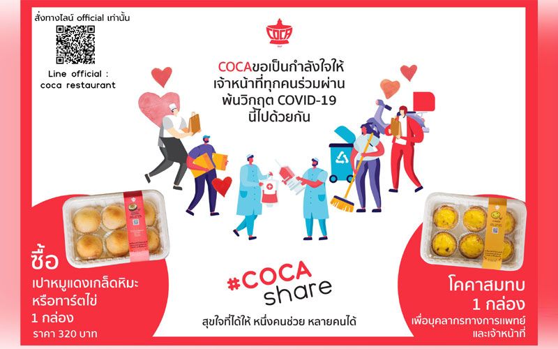 ร่วมส่งต่อกำลังใจ แชร์อาหารเพื่อสุขภาพ ไปให้ถึงมือคุณหมอ ในแคมเปญ “COCA Share สุขใจที่ได้ให้ หนึ่งคนช่วย หลายคนได้” เพียงซื้อ เปาหมูแดงเกล็ดหิมะ หรือ ทาร์ตไข่โคคา 1 กล่อง ในราคา 320 บาท ผ่าน Line Official: COCA Restaurant คลิก https://lin.ee/j4GXajU และบริการ COCA Delivery