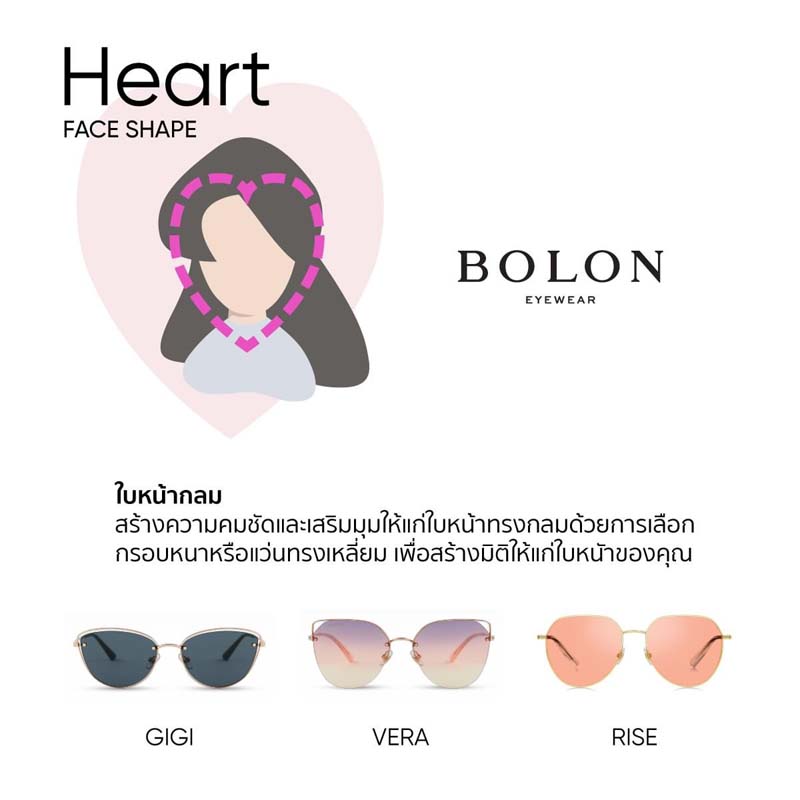 และสุดท้ายซึ่งเป็นรูปทรงใบหน้าที่หาได้ไม่ง่ายนัก นั่นก็คือ ใบหน้ารูปหัวใจ ซึ่งมีสัดส่วนใบหน้าช่วงบนบริเวณหน้าผากกว้างกว่าช่วงล่างบริเวณแก้มและกรามค่อนข้างชัดเจน การแก้ปัญหาจะคล้ายกับผู้ที่มีใบหน้ากลม โดยเลือกกรอบแว่นทรงเหลี่ยมที่มีขนาดใหญ่เพื่อพรางสัดส่วนให้ใบหน้าช่วงล่างดูใหญ่สมดุลกับช่วงบน ผสมกับการเลือกกรอบแว่นที่มีความหนาสักเล็กน้อย เพื่อสร้างมิติความลึกให้ใบหน้าดูกลมกลืนไม่ว่าจะมองจากด้านใดก็ตาม