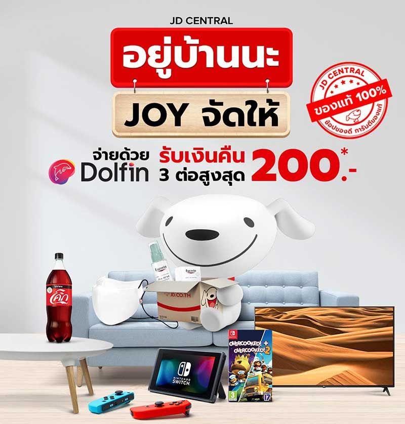 นอกจากนี้ เจดีเซ็นทรัลยังจับมือกับดอลฟิน แอพกระเป๋าตังค์ออนไลน์ เฉพาะลูกค้าที่ช็อปปิ้งในกลุ่ม “อยู่บ้านนะ JOY จัดให้”ที่ชำระเงินผ่านแอพดอลฟิน สามารถรับโบนัสเงินคืน 3 ต่อ สูงสุด 200 บาท พร้อมสิทธิพิเศษอื่นๆ จากพาร์ทเนอร์บัตรเครดิตต่างๆ ที่จะมอบส่วนลดเพิ่มสูงสุด ٣٥٠ บาทพร้อมเครดิต เงินคืนสูงสุด 4,000 บาท และแลกรับเจดีพ้อยท์แบบคูณสาม สะสมเอาไว้ใช้แทนเงินสดในการช็อปครั้งต่อไป