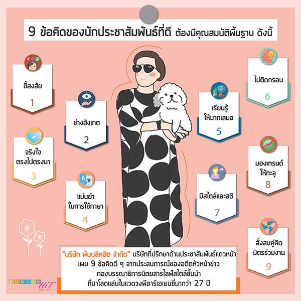 ลองมาเรียนรู้ผ่านเรื่องราวของนักเขียนสู่นักประชาสัมพันธ์ของ ตุ๊ก-เพียงเพ็ญ พรายแสง แห่ง บริษัท พับบลิคฮิต จำกัด บริษัทที่ปรึกษาด้านประชาสัมพันธ์แถวหน้า ที่บอกเล่า 9 ข้อคิดดีๆ จากประสบการณ์อดีตหัวหน้าฝ่ายข่าวกองบรรณาธิการนิตยสารไลฟ์สไตล์ชั้นนำ มาโลดแล่นในแวดวงพีอาร์เอเจนซี่ (PR Agency หรือ Public Relations Agency) มากว่า 27 ปี เพื่อให้รู้ว่านักประชาสัมพันธ์หรือพีอาร์ที่ดี ต้องมีคุณสมบัติพื้นฐานอย่างไร โดยเฉพาะในภาวะวิกฤติของการแพร่ระบาดโควิด-19 เช่นนี้