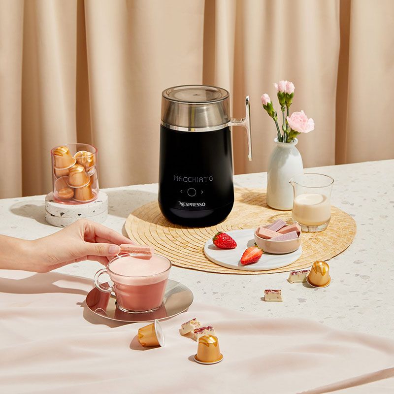 PINKY CAFFE MACCHIATO (พิงกี้ คาเฟ่ มัคคิเอโต้) สูตรนี้เหมาะสำหรับสายหวาน เป็นการผสมผสานกันของขนมเครมบรูเล่และสตรอว์เบอร์รี่ ให้ความรู้สึกเหมือนรับประทานขนมหวานเริ่มต้นง่ายๆ ด้วยการสกัดแคปซูลกาแฟ Barista Creations Caramel Crème Brulée(บาริสต้า ครีเอชั่นส์ คาราเมลเครม บรูเล่) ปริมาณ 25 มล. จากเครื่องชงกาแฟเนสเพรสโซ นำกาแฟที่ได้ใส่ในโถเครื่อง Barista Recipe Maker จากนั้นเติมนมสดลงไป ตามด้วยไซรัปกลิ่นสตรอว์เบอร์รี่ ½ ช้อนโต๊ะ และกดปุ่มเมนู Latte Macchiato(ลาเต้ มัคคิเอโต้) เมื่อเครื่องทำงานเสร็จแล้วให้เทกาแฟลงในแก้วคาปูชิโนที่เตรียมไว้และตกแต่ด้วยช็อกโกแลตรสสตรอว์เบอร์รี่หรือสตรอว์เบอร์รี่สดตามความต้องการ