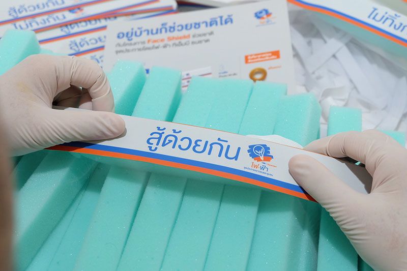 กิจกรรม “Face shield ช่วยชาติ” ครั้งนี้ ได้รับความร่วมมือจากภาคเอกชน บริษัท รุ่งแสงไทย อินเตอร์แมทเทรส จำกัด ผู้ผลิตที่นอนโฮมแมท ที่ได้ร่วมบริจาควัสดุพียูโฟม เพื่อเป็นวัสดุในการจัดทำ Face shield จำนวน 4,000 ชิ้นโดยมีมาตรการเรื่องความสะอาด ปลอดภัยและอนามัยระหว่างการจัดทำ ซึ่งในทุกขั้นตอนจะทำงานร่วมกันแบบ SocialDistancing คือ ต่างคนต่างทำ และส่งมอบแก่โรงพยาบาลต่อไป ทั้งนี้ได้เปิดรับอาสาสมัครจำนวนทั้งสิ้น 100 คนแบ่งกันทำคนละ 40 ชิ้น รวมทั้งหมด 4,000 ชิ้น มอบให้ 3 โรงพยาบาล ได้แก่โรงพยาบาลรามาธิบดี โรงพยาบาลราชวิถี และโรงพยาบาลกลาง เป็นที่เรียบร้อยแล้ว ทั้งนี้ผู้สนใจสามารถติดตามกิจกรรมดีๆ เพื่อสร้างการเปลี่ยนแปลงให้สังคมดีขึ้นอย่างยั่งยืนที่ www.tmbfoundation.or.th