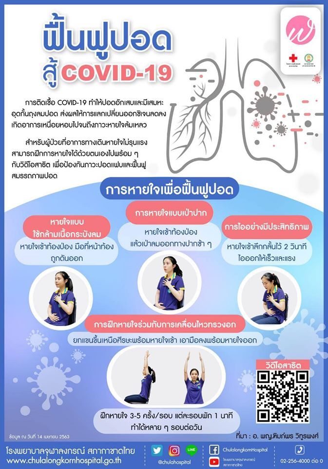 25 เมษายน 2563 บนเพจเฟซบุ๊ก ภาควิชาเวชศาสตร์ฟื้นฟู คณะแพทยศาสตร์ จุฬาลงกรณ์มหาวิทยาลัย ได้โพสต์สอนวิธีการฝึกหายใจ เพิ่มความแข็งแรงให้กับปอด เพิ่ม Oxygen เข้าปอด ชะลอความรุนแรงหากป่วยเป็นโควิด-19 ผู้ที่ไม่ป่วยก็สามารถฝึกได้