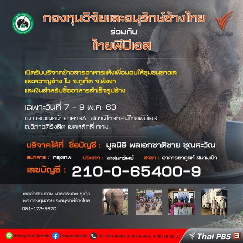 โดยในวันที่ 7-9 พฤษภาคม 2563 รถจะจอด ณ บริเวณหน้าอาคาร สถานีโทรทัศน์ไทยพีบีเอส ถนนวิภาวดีรังสิต เขตหลักสี่ กทม. หรือบริจาคผ่านเลขบัญชี 210-0-65400-9 ชื่อบัญชี มูลนิธิพลเอกชาติชาย ชุณหะวัณ ธนาคาร กรุงเทพ ประเภทบัญชีสะสมทรัพย์ สาขา อาคารยาคูลท์ สนามเป้า หรือติดต่อสอบถาม ได้ที่ นายอลงกต ชูแก้ว ผอ.กองทุนวิจัยและอนุรักษ์ช้างไทย โทร 081-172-5670