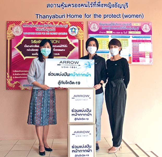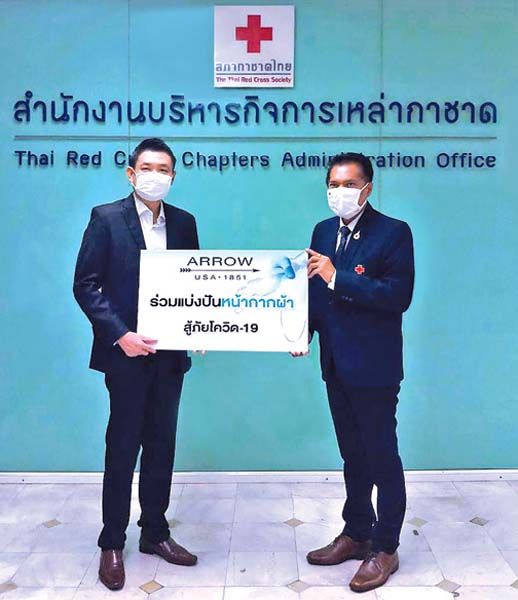 ผลิตภัณฑ์เครื่องแต่งกาย ARROW ร่วมเป็นส่วนหนึ่งเพื่อการแบ่งปัน “หน้ากากผ้า” สู้ภัยโควิด-19 ซึ่งผลิตจากเนื้อผ้า COTTON 100% นุ่ม ใส่สบาย ไม่อึดอัด ช่วยปัองกันฝุ่นละออง การกระจายจากการไอหรือจาม อีกทั้ง ยังสามารถซักและนำกลับมาใช้ซ้ำได้ โดยมี สวัสดิ์ โพธิ์สินสมวงศ์ ผู้อำนวยการฝ่ายผลิตภัณฑ์ ARROW นำหน้ากากผ้าไปมอบให้กับ สภากาชาดไทย (The Thai Red Cross Society) เพื่อส่งมอบต่อไปยัง สำนักงานเหล่ากาชาดจังหวัดสุรินทร์