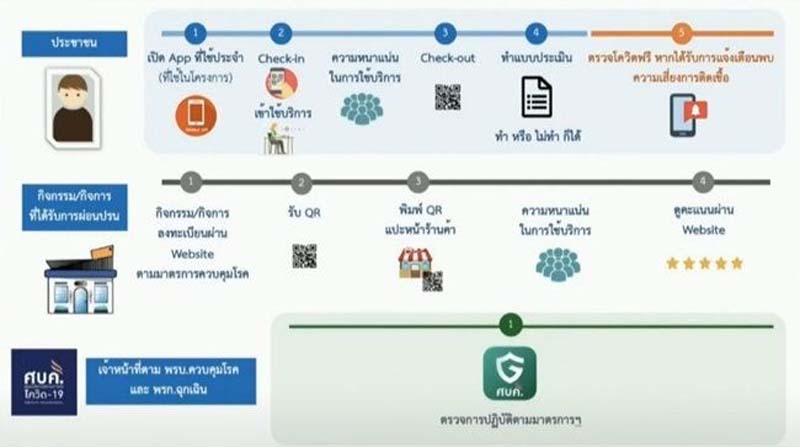 อาทิ ในส่วนของประชาชน เมื่อจะเข้าไปเที่ยวห้างต้อง “เช็คอิน” ผ่านสแกนคิวอาร์โค้ดเมื่อช้อปเสร็จก็ “เช็คเอาท์” จะเป็นเครื่องมือเพื่อช่วยให้การสอบสวนโรคทำได้อย่างถูกต้องและรวดเร็ว หากกรณีที่ตรวจสอบภายหลังพบว่ามีการติดเชื้อในช่วงใดช่วงหนึ่ง