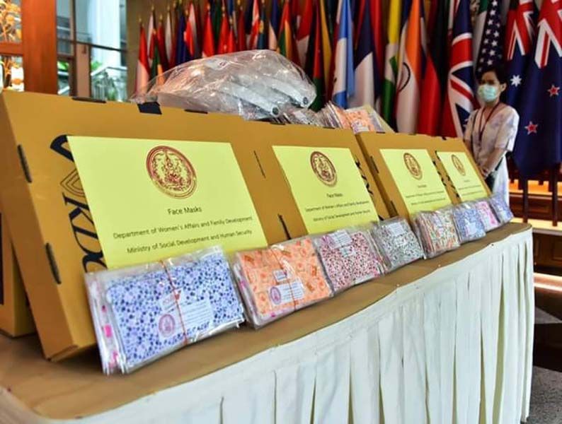 นางสาวอุษณี กังวารจิตต์ อธิบดีกรมกิจการสตรีและสถาบันครอบครัว (สค.) เปิดเผยว่า จากสถานการณ์การแพร่ระบาดของไวรัสโควิด-19 นายจุติ ไกรฤกษ์รัฐมนตรีว่าการกระทรวงการพัฒนาสังคมและความมั่นคงของมนุษย์ (พม.) ได้มีนโยบายเปิดพื้นที่ให้จิตอาสา เจ้าหน้าที่กระทรวง ตลอดจนเครือข่ายด้านสังคม ร่วมมือร่วมใจกันทำหน้ากากอนามัยแบบผ้า เพื่อแจกจ่ายให้กับประชาชนทั่วไป ใช้ป้องกันตนเองจากการแพร่ระบาดของไวรัสโควิด-19 ซึ่งกรมกิจการสตรีฯ โดยศูนย์เรียนรู้การพัฒนาสตรีและครอบครัว 8 แห่งทั่วประเทศ ได้เปิดการสอนการทำหน้ากาก โดยกลุ่มอาชีพสตรี และจิตอาสาได้ร่วมกันผลิตและแจกจ่ายให้กับประชาชนทั่วไปมาตลอด ตั้งแต่ต้นเดือนมีนาคมที่ผ่านมา
