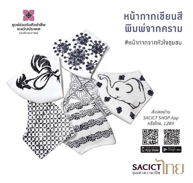 และเพราะโควิด-19 ยังอยู่กับเราอีกพักใหญ่ วันนี้ชาวบ้านที่นั่นจึงได้รวมกลุ่มกันทำหน้ากากทางเลือกภายใต้การส่งเสริมของ ศูนย์ส่งเสริมศิลปาชีพระหว่างประเทศ (องค์การมหาชน) หรือ SACICT โดยการนำของ ครูภารดี วงศ์ศรีจันทร์ ครูช่างศิลปหัตถกรรมปี 2555 ที่สร้างสรรค์หน้ากากจากผ้าฝ้ายสีขาวจากมูลนิธิส่งเสริมศิลปาชีพ ในสมเด็จพระนางเจ้าสิริกิติ์ พระบรมราชินีนาถ มาพิมพ์ลายด้วยบล็อกไม้แบบโบราณ ผสมผสานด้วยการเขียนลายด้วยมือแบบอิสระ ทั้งลายไก่แสนอ่อนช้อยราวกับมีชีวิต และลายช้างแสนน่ารัก โดยใช้สีธรรมชาติที่ทำมาจากต้นคราม ซับด้านในด้วยผ้ามัสลินและผ้าสาลูอีก 2 ชั้น สวมใส่สบายดีไซน์สวย ในราคาชิ้นละ 75 บาท