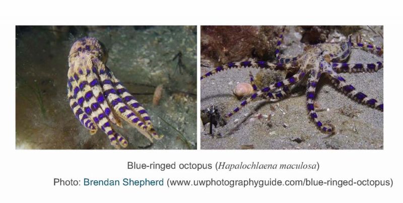 กรมวิทยาศาสตร์การแพทย์ กระทรวงสาธารณสุข เตือนระวังอันตรายจากหมึกสายวงน้ำเงินหรือหมึกบลูริง (Blue-ringed octopus) มีพิษร้ายแรงมากที่สุดชนิดหนึ่งของโลก มีสารพิษเรียกว่าเตโตรโดท็อกซิน