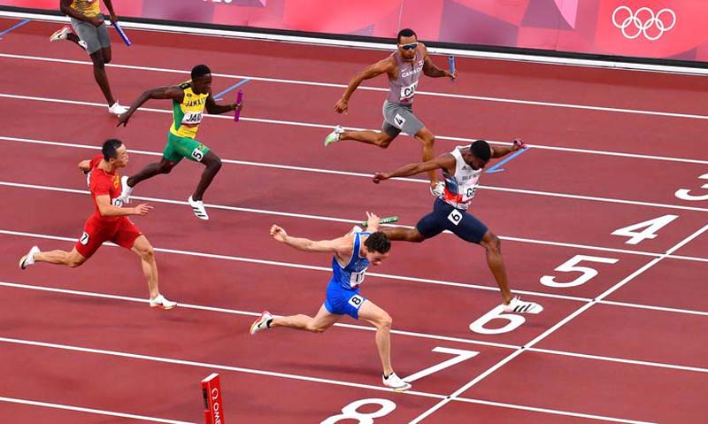 ฟิลิปโป โทซู นักวิ่งผลัดทีม 4x100 เมตร ไม้สุดท้ายของอิตาลี พุ่งเข้าเส้นชัยเป็นคนแรก เฉือนชนะ นาธาเนียล มิตเชลล์-เบลค คู่แข่งจากอังกฤษที่เขาเส้นชัยเป็นที่สอง ในการแข่งขันวิ่งผลัด 4x100 ทีมชาย คว้าเหรียญทองประวัติศาสตร์ให้อิตาลีได้แบบพลิกความคาดหมาย