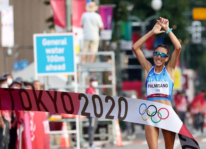 อันโตเนลลา พัลมิซาโน จากอิตาลี ชูมือยิ้มอย่างชื่นมื่น ขณะวิ่งผ่านเส้นชัยเป็นคนแรก คว้าเหรียญทองกรีฑาอีกเหรียญให้อิตาลี ในการแข่งขันเดินทน 20 กิโลเมตรหญิง