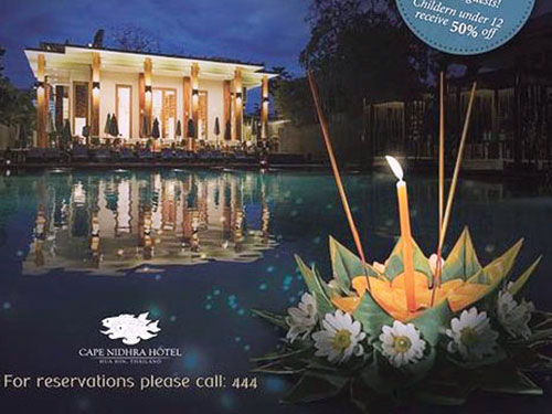 โรงแรมเคปนิทรา หัวหิน นำเสนอบุฟเฟ่ต์มื้อค่ำสไตล์บาร์บีคิว ชมวิวสวยริมทะเลท่ามกลางบรรยากาศใต้แสงจันทร์ ท่านละ 1,300 บาทถ้วน พร้อมเครื่องดื่มต้อนรับฟรี และกิจกรรมประดิษฐ์กระทงแสนสวยในแบบของคุณ ช่วงเวลา 15.00 น. ที่ ห้องอาหารร็อคส์โทร.032-516600