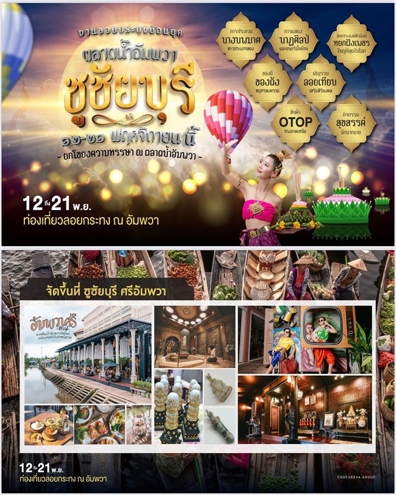 ห่างหายไปนานร่วม 2 ปี พอเปิดประเทศปุ๊บ ไฮโซดังเจ้าของฉายาไฮโซเพชรพันล้าน “ชูชัย ชัยฤทธิเลิศ” ประธานบริหาร บริษัท ชูชีวา กรุ๊ป จำกัด. ผู้ก่อตั้ง “ชูชัยบุรีศรีอัมพวา” โรงแรมระดับห้าดาว ริมคลองอัมพวา เตรียมจัดงานอย่างยิ่งใหญ่ “ลอยกระทงย้อนยุค ตลาดน้ำอัมพวา ชูชัยบุรี” เพื่อมุ่งหวังพลิกฟื้นเศรษฐกิจ ปากท้องของพี่น้องชาว อัมพวา ให้กลับคืนมาเป็นดั่งเวนิสแห่งสมุทรสงครามในระหว่างวันที่ 12 -21 พฤศจิกายน พ.ศ. 2564 พบกับกิจกรรม การออกร้านของศิลปิน นักร้อง ดารา และยูทูบเบอร์ ชื่อดัง ,การออกร้านของกลุ่มเครือข่ายผู้ประกอบการ 17 จังหวัดทางภาคเหนือ,การออกร้านของกลุ่มร้านค้า ของดี ของเด่น ของอัมพวา และสมุทรสงคราม พร้อมโชว์การ แสดงศิลปวัฒนธรรม และดนตรีพื้นบ้านจากทางภาคเหนือ , ,การแสดงศิลปวัฒนธรรม โขน ละครเล็ก ดนตรีพื้นบ้าน และ จินตลีลา ของโรงเรียนต่างๆ ในพื้นที่จังหวัดสมุทรสงคราม, การแสดงโชว์ มายากล จากรายการไทยแลนด์ก็อตทาเลนท์ , ชมการประกวดนางนพมาศ LGBT สาวประเภทสอง จากน้องๆมิสทราน และร่วมถ่ายรูปกับบัลลูนยักษ์ขนาด 7เมตร , ลอยกระทงย้อนยุค ร่วมกับเหล่าศิลปินดารา , อีกทั้งยังได้ร่วมสักการะขอพรสิ่งศักดิ์สิทธิ์ ศิวลึงค์หยกประดับเพชรและอัญมณีล้ำค่ำอีกด้วย
