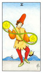 อิทธิพลของไพ่ 2 เหรียญ (Two of Pentacles) คุณที่มีหนี้สินจะถูกทวงถามเล่นเอาเครียดจัด และคนลุ้นโชคลาภจะได้เข้ามาอย่างไม่คาดฝัน ความรักจะมีปัญหากันบ้างเหตุเพราะเรื่องเล็กน้อย ทำให้มึนตึงใส่เข้าหากัน ด้านการงานให้ระวังปัญหาส่วนตัวจะทำให้ถุกโจมตี และคนที่มีงานส่วนตัวแม้ได้งานเข้ามาแต่จะมีเรื่องจุกจิก ช่วงนี้ควรทำบุญไหว้บูชาท้าวเวสสุวรรณเพื่อเสริมดวงชะตาชีวิตตนเอง