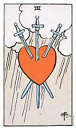 อิทธิพลของไพ่ 3 ดาบ (Three of Swords) คุณจะมีความัดแย้งกับเพื่อนร่วมงานเหตุเพราะแนวคิดการทำงานที่ไม่ตรงกัน และที่มีงานส่วนตัวจะมีเรื่องจุกจิกเข้ามากวนใจ ส่วนการเงินอย่าใจอ่อนไปค้ำประกันใครเพราะจะเดือดร้อนเป็นอย่างหนัก ด้านความรักเหตุเพราะความขึ้หึงทำให้มีปัญฆากับแฟน และที่แอบชอบใครคงต้องทำใจ เพราะเขาคิดกับเราแค่เพื่อน ช่วงนี้ควรหมั่นทำบุญทำทานปล่อยนกปล่อยปลาเพื่อเป็นการเสริมดวงชะตาชีวิตตนเองให้ดีขึ้น