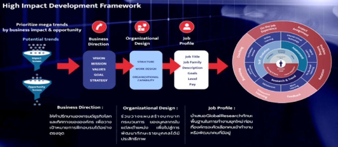ในกระบวนการสร้างผู้นำยุคใหม่ (Adaptive Leadership) ให้กับบุคลากรในองค์กร จะต้องเริ่มตั้งแต่ “เจาะลึกกระแสโลกและทิศทางของธุรกิจ” เพื่อให้ทราบว่าองค์กรต้องเผชิญหน้ากับอะไร เพื่อหาแนวทาง พัฒนากลยุทธ์ให้สอดรับการเปลี่ยนแปลง จากนั้นจึงร่วมวางแนวทางกลยุทธ์องค์กรและวางโครงสร้างองค์กร รวมถึงการออกแบบตำแหน่งหน้าที่การทำงานต่างๆ จากนั้นจึงเข้าสู่ขั้นตอนออกแบบการเรียนรู้ของคนในองค์กรขึ้น ผ่าน Framework ที่ชื่อ High Impact Development Framework ที่จะเจาะลึกลงไปถึง 8 สมรรถนะของผู้นำยุคใหม่ ประกอบไปด้วย AGILITY, DISRUPTIVE, ATTITUDES, PERSONALIZATION, TECHNOLOGY, INNOVATION, LIVE WELL BEING, EMPATHY ซึ่งการสร้างสมรรถนะเหล่านี้ จะพัฒนาได้ด้วยกลุ่มทักษะที่ถูกร้อยเรียงออกมาเป็นโปรแกรมการเรียนรู้ที่เหมาะสมตั้งแต่ระดับต้น กลาง และสูง โดยผ่านแผนฝึกอบรมที่นำทฤษฎี 70 : 20 : 10 มาผสมผสานทั้งการเรียนรู้จากหลักสูตร (10) การแลกเปลี่ยนประสบการณ์หลังเรียนรู้ (20) รวมถึงการนำความรู้ไปปฎิบัติใช้จริง (70) หาข้อมูล เพิ่มเติมได้ที่ www.Beyondtraining.in.th